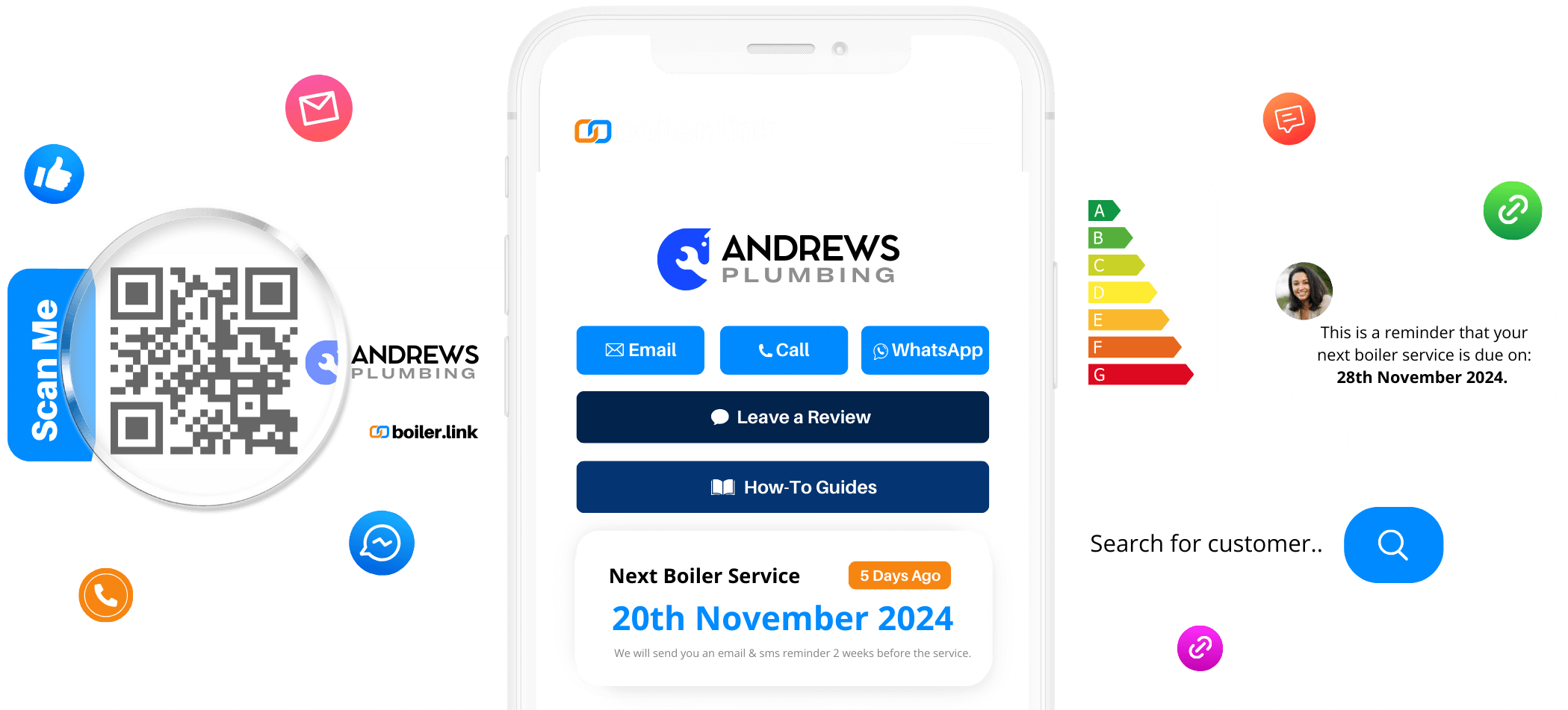 When you add the QR label to a boiler, the customer can then scan this label and see all your details including company name, email and telephone number. They can even leave a review directly by scanning the QR.